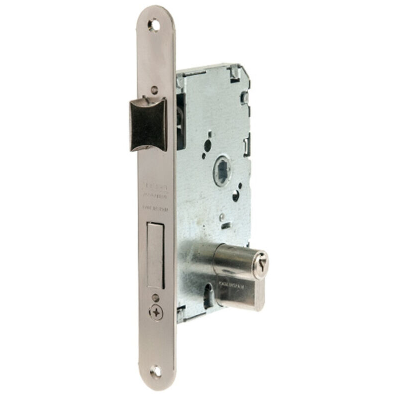 Serratura Tesa 2010-p-hn/60. - Serratura da infilare serie 2010 per porte in legno. - Interasse: 47 mm. - Entrata 60 mm. - Collo 8 mm. - Frontale tondo. - Reversibile. - Cilindro europeo TE-5 con 3 chiavi in acciaio nichelato. Funzionamento: - Il cilindro aziona la leva (2 giri) e lo scrocco. - Il collo aziona il fermo.