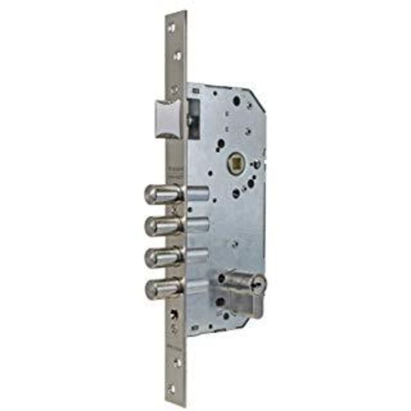 Serratura di sicurezza da infilare per porte in legno. Entrata 50 mm. Cilindro 30-30 con chiave a punta. Rosetta di sicurezza. Frontale e frontale in acciaio inox con bordi squadrati.