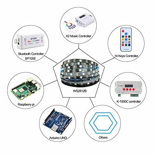 Strisce LED programmabile Dream Color, ogni 1 LED contiene 1 IC, IC WS2812B 5050SMD integrato, puoi controllarli individualmente. Funziona alla grande con Arduino, libreria Ready-to-Go, libreria FastLED e Raspberry Pi ecc. È facile da programmare. Supporta SP110E SP105E SP108E SP110E SP601E ecc. Controller APP, CSY07 CSY08 X2 SP106E SP107E ecc. Controller musicale, SP501E ecc. Smart WiFi Alexa Controller.