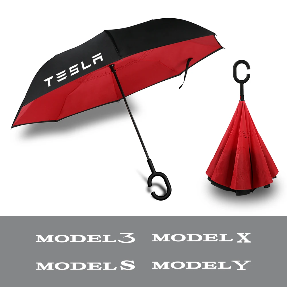 For Tesla Model 3 S X Y P100D Long-Handle Inverted Reverse C Shaped Double Layer Rainy Sunny Umbrella Car Words Logo Accessories