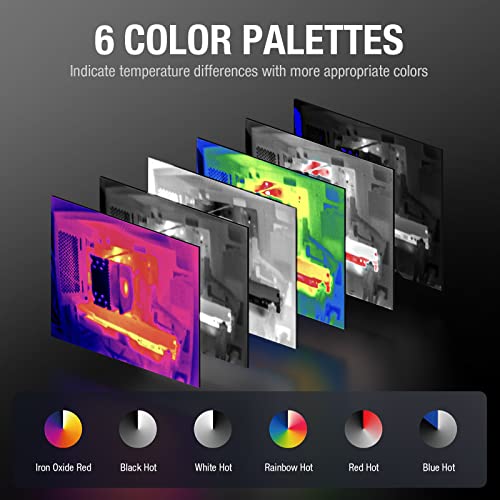✦[ 6 tavolozze di colori e 3 dimensioni di temperatura]: la termocamera a infrarossi dispone di 6 tavolozze di colori (argento, bianco caldo, nero caldo, arcobaleno, rosso caldo e blu freddo), quindi è facile cambiare diversi colori per soddisfare determinati scenari! L'utente può selezionare manualmente 3 dimensioni per misurare la temperatura dell'area nell'app: punto, linea (valore massimo e basso) e area (valore massimo e più basso).
