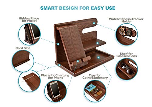 Teslyar Docking Station in Legno per Smartphone Supporto Portafoglio Supporto Orologio Regalo da Uomo Marito Moglie Natale Regalo per papà Supporto da Comodino Legno massello in Frassino (Marrone)