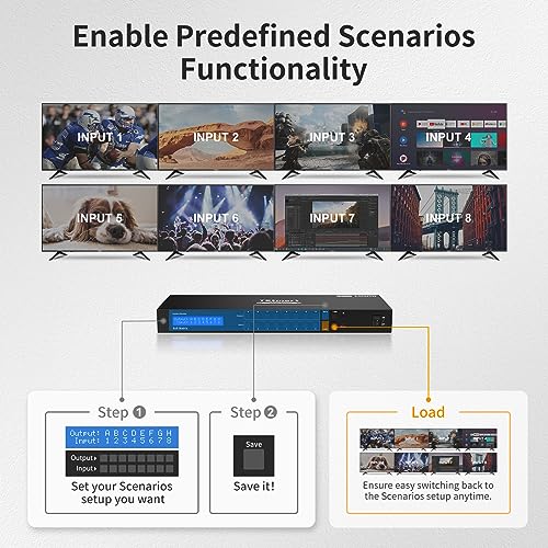 ✤A Solution parfaite pour acheminer l'une des 8 sources vidéo HDMI vers l'un des 8 écrans HDMI displays✤Allows 8 appareils de source HDMI pour se connecter à 8 écrans HDMI en même temps. matrice est doté d'un écran LCD sur le panneau avant pour vous montrer l'état de la connexion en temps réel. Les scénarios les plus courants sont les suivants: salles de classe, auditoriums, grands magasins, systèmes audiovisuels commerciaux et résidentiels, etc.