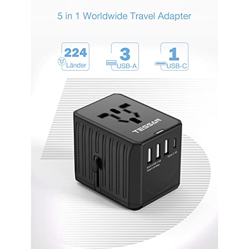 Adattatore da Viaggio Universale con 3USB e 1USB C: TESSAN adattatore presa viaggio è dotato di 3 USB (uscita totale 5V/2,4A MAX) ,1 USB C (uscita totale: 5V/3A) e 1 AC (supporta 100-250V, 50/60Hz, 10A di carico massimo. 2500W a 250VAC, 1100W a 110VAC), in grado di ricaricare fino a 5 dispositivi contemporaneamente, in modo da non dover portare con sé adattatori extra in viaggio.