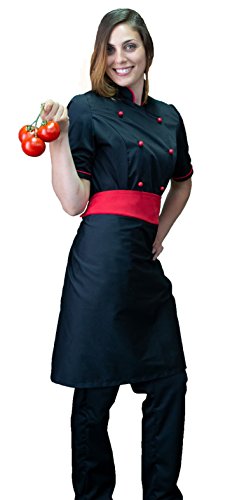 Tessile astorino Ricamo Gratuito - Completo Cuoco da Cucina - Nero e Rosso - Divisa Chef Donna Manica Corta - Pantalone, Giacca e Grembiule - Made in Italy (XS)