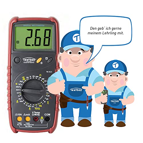 Testboy 313 Multimetro digitale (protezione automatica della zona di misurazione, ampio LCD retroilluminato, misurazione temperatura, CAT III 600 V, guscio in plastica ABS), rosso/nero