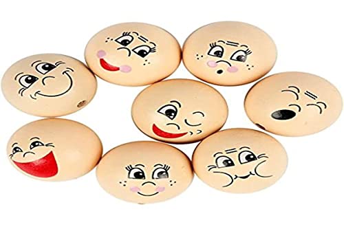 Palline di legno con buco, color pelle, con 8 facce divertenti, 2 pz. ognuna