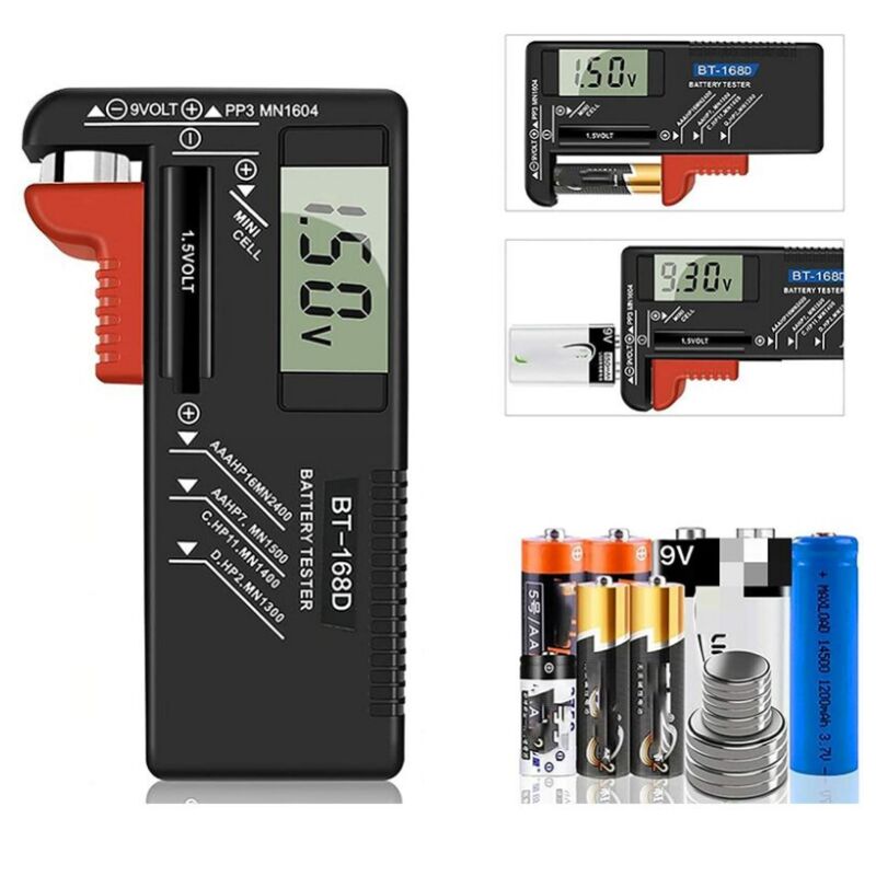 Piccolo e portatile: piccolo tester per batterie AA AA (BT-168D), compatto e leggero, facile da trasportare. Testare diversi tipi di batterie: il tester per batterie è adatto per batterie domestiche standard e ricaricabili . AA, AAA, C, D, 1,5 V, 9 V, tester per batterie a bottone. Funzionamento senza batteria: facile da leggere, i numeri indicano il livello di carica. Non è richiesta alcuna batteria. Viene attivato dalla batteria sotto test. Facile da leggere: il design di un dispositivo portatile è facile da leggere: la tensione della batteria viene visualizzata sullo schermo LCD. Risparmio della batteria: puoi facilmente testare la tensione della batteria per determinare se la capacità della batteria è bassa o alta, il che ci impedisce di sprecare una batteria perfetta buttando via una buona batteria.