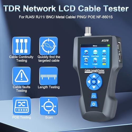 Tester per cavi di rete KOLSOL, tester di lunghezza di linea LCD multifunzionale AT278 TDR Tester di punti di interruzione Tracker RJ45/RJ11/BNC/cavo metallico/PING/POE Test lampeggiante NF-8601S