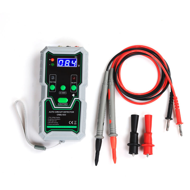 Caratteristiche: Il rilevatore di circuiti è un pratico strumento ausiliario progettato per rilevare guasti del circuito a corrente continua a bassa tensione dei macchinari di trasporto. La parte anteriore dello strumento con illuminazione a LED, più comoda alla luce, non è buona da usare. attraverso la batteria interna 9 per guidare, misurare la batteria, il valore della tensione del circuito (DCL'intervallo di tensione del display (DC) è più ampio e anche la luce rossa o la luce verde sul lato è accesa, rappresentando il terminale positivo + o il terminale negativo "di la fase rilevata stampa Il limite superiore raggiunge DC: 0-100V. Visualizza il valore di tensione della batteria di accumulo e del circuito tramite tubo digitale. Rileva il terminale positivo "+" o il terminale negativo "-" della batteria di accumulo e del circuito che è verde chiaro positivo, rosso chiaro negativo. Specifiche: Batteria: 9V: Pennarello: rosso nero 1 ciascuno (lunghezza totale: 110 cm);