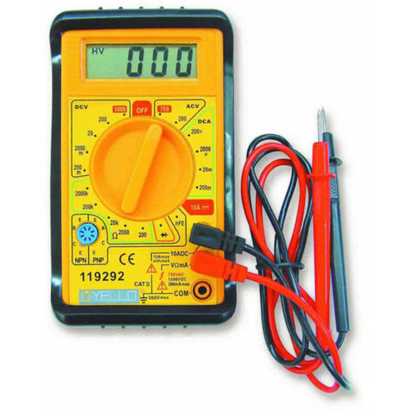 Tester digitale multifunzione Tester digitale / multimetro ideale per misure di resistenza, test diodi e transistor, misurazione di corrente continua (DC) e alternata (AC). Corpo in ABS con protezione in gomma e custodia in gomma con clip per cintura. Il tester digitale dotato di protezione da sovraccarico e indicatore di batteria scarica (2x batterie AAA, non incluse). In dotazione: 2x puntali