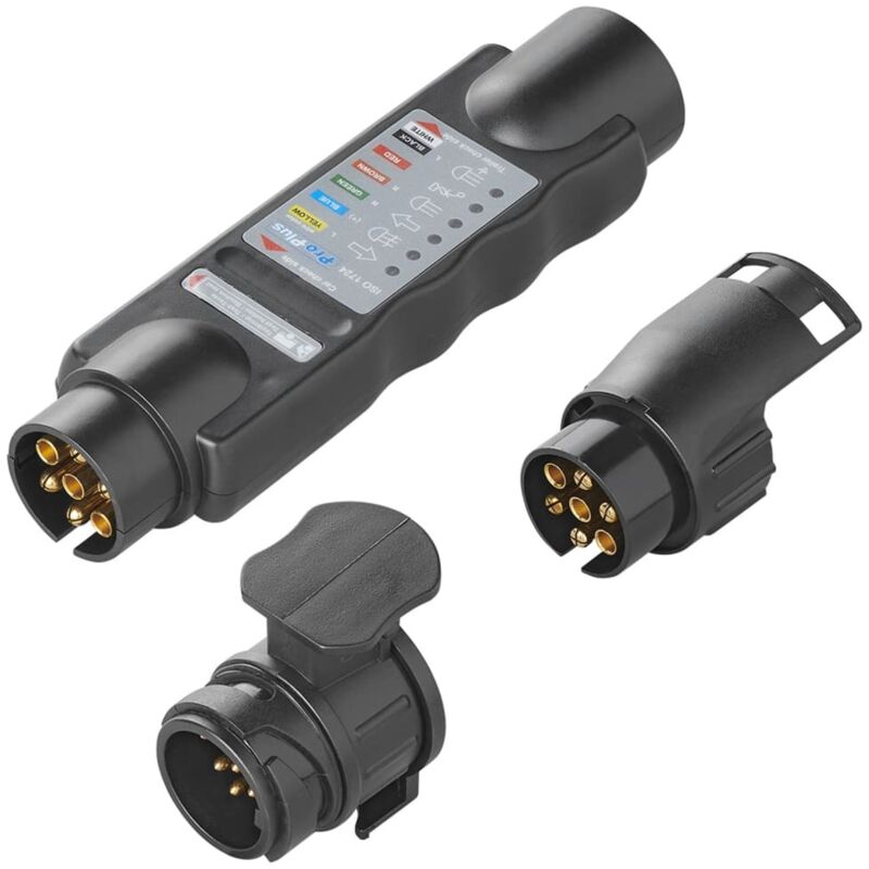 Con questo tester del fascio di traino a 7 perni 343524 della ProPlus puoi verificare le luci del vostro automobile e sincronizzarli con le luci del rimorchio. Prima di tutto, dovete connettere il tester alla spina di corrente dell'automobile. Se l'automobile ha una presa a 13 perni, dovete utilizzare anche un adattatore. Attivate l'accensione e controllate tutte le funzioni con l'aiuto di una seconda persona. Se la presa di corrente è impostata correttamente, l'indicatore corrispondente si accende (anche quando verificate la direzione dell'indicatore, la luce lampeggerà). La consegna include 1 tester e 2 adattatori. Voltaggio: 12 V Numero di perni: 7 Schema elettrico: 7 poli (ISO 1724) La consegna include 1 tester e 2 adattatori SKU: 404042