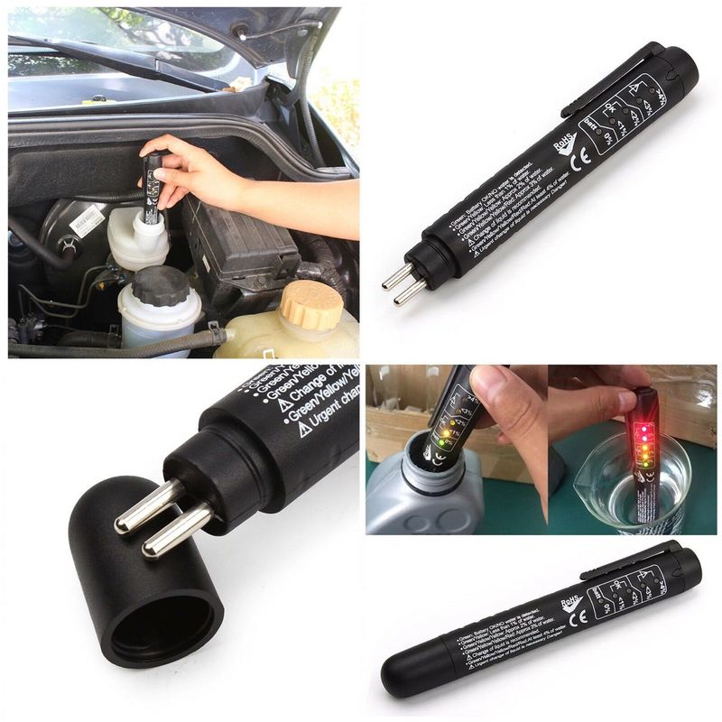 Progettato per il controllo della qualità del freno controllando se la qualità è ok. Questo test misura l'umida presente nel liquido dei freni della vostra auto, indicando se il liquido è ok oppure è da sostituire, il valore è indicato da 5 LED di facile lettura. Piccolo e leggero da trasportare per una maggiore comodità, davvero un ottimo aiuto per il vostro viaggio. La qualità è testata e indicata su cinque LED in termini di percentuale di acqua nel liquido dei freni. bastano pochi secondi per conoscere i risultati Calibrato per auto con liquido per freni DOT 4. Adatto per test DOT 3 / DOT 4 Batteria inclusa ISTRUZIONI Dopo aver inserito la batteria mini-stilo da 1,5V, accendere il tester per liquido freni premendo il pulsante che trovate nella parte superiore del tester (tipo penna). Si accenderà il led di colore verde. Svitare il coperchio per il serbatoio del liquido di freno e togliere il tappo. Immergere le sonde del tester nel liquido dei freni. Il display indicherà la