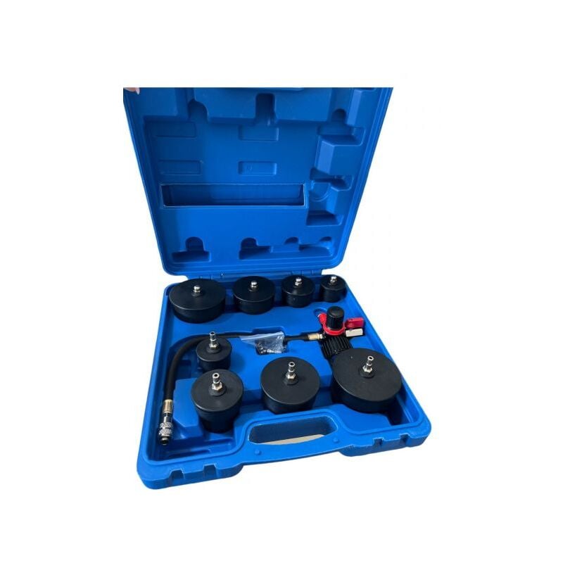 Set 9pz Tester di tenuta turbocompressore manometro della pressione dell'aria FS-22981 Il nostro set di tester per perdite del sistema turbo è dotato di un regolatore di bassa pressione che consente di collegare il sistema turbo con l'aria dell'officina. Ciò semplifica l'individuazione e l'individuazione delle perdite all'interno del sistema, garantendo prestazioni ottimali. Può essere utilizzato anche per testare la tenuta dei tubi del sistema di raffreddamento.Collegando il lato di uscita del turbo e l'ingresso di aspirazione, il nostro set aiuta a individuare le perdite d'aria nei componenti del sistema turbo.Il manometro del nostro set è dotato di valvola di intercettazione e regolatore. Ciò impedisce una sovrapressurizzazione durante il processo di prova delle perdite, rendendolo più efficiente e sicuro.Gli adattatori vanno da 35 mm a 90 mm, offrendo un'ampia gamma di adattabilità e garantendo versatilità per vari sistemi turbo.