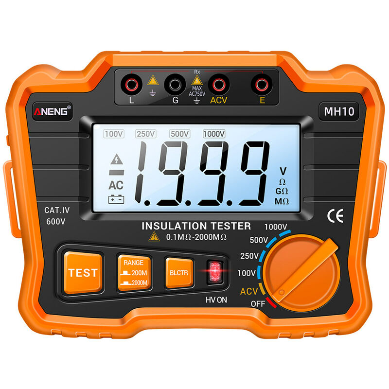 Questo è uno strumento multifunzione in grado di misurare la resistenza di isolamento e la tensione CA. Ha un aspetto alla moda e prestazioni stabili, può essere utilizzato per misurare macchinari elettrici, cavi, apparecchiature elettromeccaniche, apparecchiature di telecomunicazione, impianti elettrici e altre resistenze di isolamento. Nota: 1. Si prega di leggere attentamente il manuale dell'utente prima dell'uso. 2. Le dimensioni e il colore possono essere leggermente diversi a causa della misurazione manuale e delle diverse condizioni di luce. Grazie per la comprensione. Specifiche: Colore: arancione/blu (opzionale) < br />Materiale: ABS + Silicone Schermo: schermo LCD retroilluminato Tensione di uscita: 100 V/ 250 V/ 500 V/ 1000 V Misurazione della resistenza di isolamento: 0,1 MΩ-2000 MΩ Corrente di prova: 1mA (250V/ 500V/ 1000V) Corrente di cortocircuito: <1,8mA Misurazione della tensione CA: 1~ 750V Frequenza tensione CA: 40-70Hz Posizione jack: L, E Alimentazione: 6 batterie