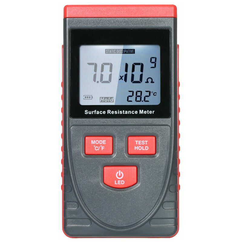 Questo misuratore di resistenza superficiale può misurare il valore di resistenza sulla superficie dell'oggetto posizionando 2 elettrodi paralleli vicino alla superficie dell'oggetto da misurare, in modo da giudicare se l'oggetto misurato è un conduttore, un isolante o statico Materiale. Nel frattempo, il misuratore può essere utilizzato per misurare la resistenza di terra dell'oggetto, che viene applicata in particolare a diversi campi antistatici. Inoltre, può misurare la temperatura ambiente come riferimento. Caratteristiche: Ampio display a cristalli liquidi per test di resistenza superficiale con retroilluminazione commutabile per una lettura chiara. 3 modi per visualizzare contemporaneamente la resistenza della superficie o le proprietà del materiale. Può misurare la temperatura ambiente: 0℃~50℃/32℉~122℉. data hold, indicazione di batteria scarica, spegnimento automatico senza operazione in 30 secondi. Dimensioni compatte e portatili, leggere, facili da trasportare e utilizzare.