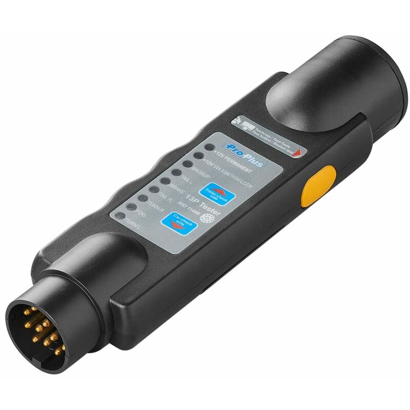 Con questo tester del fascio di traino a 13 perni 343543 della ProPlus potete verificare le luci del vostro automobile e sincronizzarli con le luci del rimorchio. Prima di tutto, dovete connettere il tester alla spina di corrente dell'automobile. Attivate l'accensione e controlla tutte le funzioni con l'aiuto di una seconda persona. Se la presa di corrente è impostata correttamente, l'indicatore corrispondente si accende (anche quando verificate la direzione dell'indicatore, la luce lampeggerà). Voltaggio: 12 V Numero di perni: 13 Escl. batteria 9 V Schema elettrico: 13 poli (ISO 11446) SKU: 404043