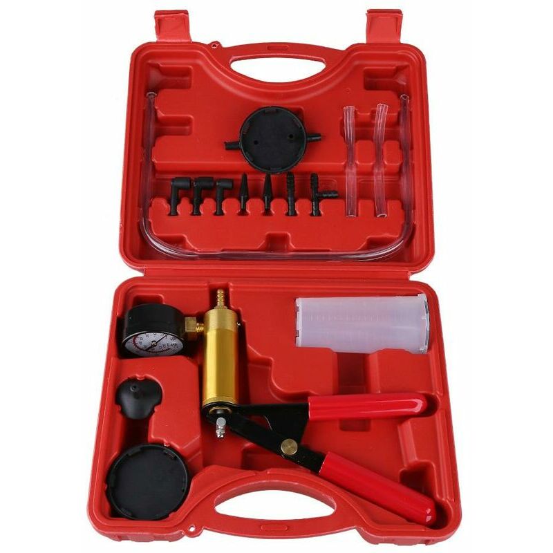 sistemi frenanti. 3. Perfetto per lo spurgo dei freni e dei tubi del carburante. 4. Pompa a mano con manometro a doppia scala di facile lettura. 5. Custodia per il trasporto per un facile trasporto e conservazione. Specifiche: Materiale: ottone e plastica ABS Scala calibro: 0-30 pollici Hg, 0-760 mm Hg. Peso della confezione: 955 g Quantità: 15 pezzi Dettaglio dimensioni: come mostrato nell'immagine < p> La confezione include: 1 x pompa per vuoto con manometro 3 x tubo di aspirazione per vuoto 2 x coperture 3 x adattatore per vite di spurgo del freno 2 x adattatore per tubo conico 1 x connettore diritto 1 x connettore per tubo a T. p> 1 x serbatoio del liquido dei freni 1 x adattatore per tazza universale (custodia per il trasporto)