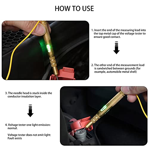 【Ampiamente Usato】Questa penna di prova per circuiti automobilistici professionali per impieghi gravosi è progettata per testare la tensione di 6-12 V CC, controllare rapidamente i fari dell'auto, le luci posteriori, i circuiti degli indicatori di direzione, le prese sbagliate, i collegamenti, i fusibili, i fili rotti.