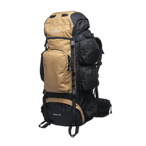 TETON Sports Zaino Explorer con telaio interno completo - Attrezzatura da viaggio regolabile - Copertura antipioggia idrorepellente, sacco a pelo e vescica idratante da 3 litri - Buck Brown, 85L