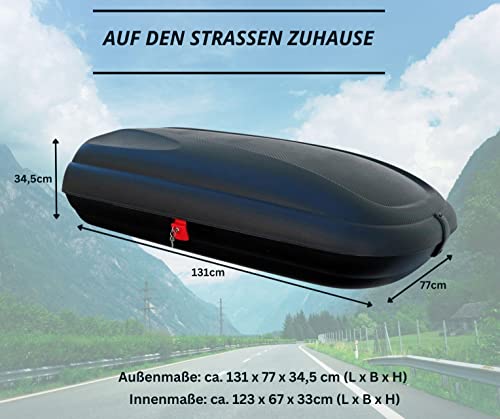 131,3 x 76,9 x 34,5 cm (lunghezza x larghezza x altezza). Perfettamente abbinato. Adatto per viaggi in vacanza o in campeggio. Lasciate che la vostra vacanza inizi già durante il viaggio. 320 litri di spazio aggiuntivo per la vostra auto