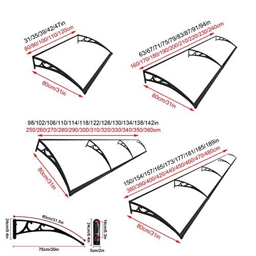 Tettoia per Porta Estensibile,Tendalino per Finestra con Staffa,Pensilina ad Arco,Copriporta in Policarbonato Trasparente,Riparo Antipioggia per Tetto,Larghezza 60/80/100/120cm (80x480cm/32"x189")