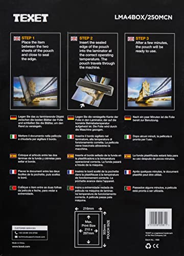 Texet, buste per plastificare, formato A4, 250 micron (confezione da 100)