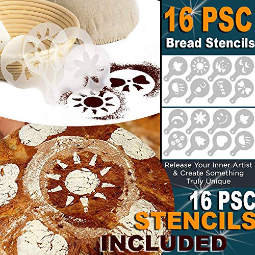 TGetWorth - Kit di panificazione che include cestino ovale di 25,4 cm, raschietto per impasto, spatola, rivestimento in lino, 16 stencil decorativi per pane