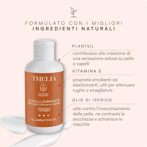 Thelia Beauty | Olio Illuminante per Viso, Corpo e Capelli, Cocco e Vaniglia, Prodotto Naturale Senza Parabeni, Dermatologicamente Testato, Made in Italy, 100 ml