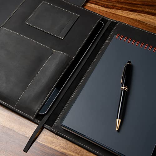 MENO È DI PIÙ: Leggero e portatile, il nostro padfolio Theodore ti ha coperto! Una classica copertina in pelle per diario è modernizzata per adattarsi agli accessori aziendali di oggi. Ideale anche per quaderni A5 (5" x 8), questo portafoglio business in pelle si adatta a un notebook B5, note sul campo e blocco note. Non cercare oltre quando hai bisogno di una soluzione per un'organizzazione ordinata e compatta in un ambiente aziendale mobile.