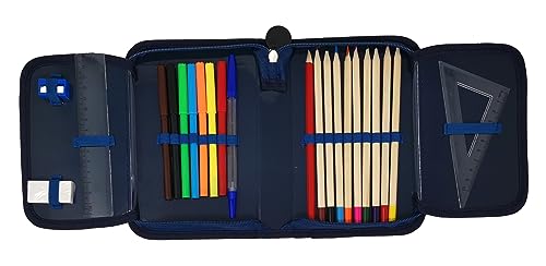 Contenuto dell'astuccio per la scuola, 22 pezzi: 9 pennarelli, 7 matite colorate, 1 matita, 1 penna a sfera, 1 gomma, 1 temperamatite, 1 righello, 1 squadra.