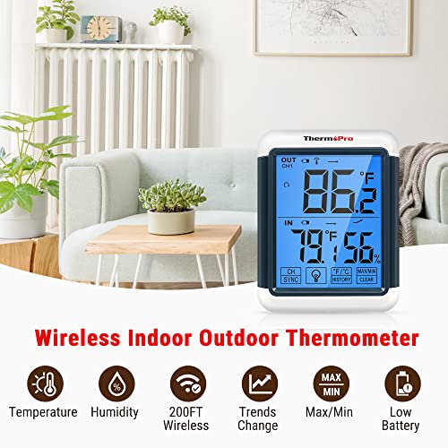 ThermoPro TP65S Wireless Termometro Igrometro Esterni e Interni Digitale con Ampio Touch Screen Retroilluminazione, Temperatura Interna e Misuratore di umidità, Temperatura Esterna, Funzione Memoria
