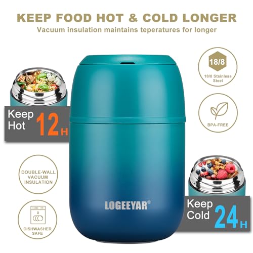 Thermos per Alimenti 500ml, Contenitore Termico per Alimenti di Acciaio Inossidabile con Cucchiaio Pieghevole, Isotermico Sottovuoto per Cibi Caldi e Freddi,Blu-verde