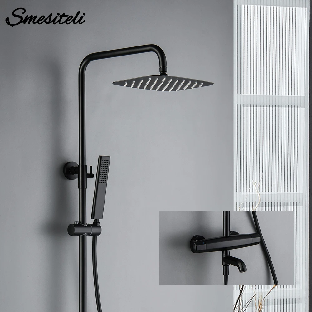 Thermostatic Three Functions Wall-mounted Rain Black Brass Bathtub Filling Mixer Multifunction Hand Shower Head Bathroom Faucet
