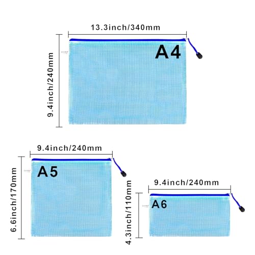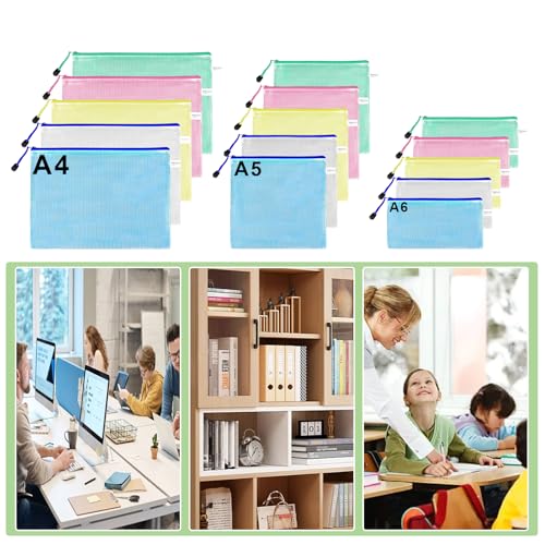 [3 set, 15 pezzi] - Borsa portadocumenti colorata con cerniera, tre dimensioni (A4, A5, A6), 5 pezzi per ogni dimensione, totale 5 colori (rosa, giallo, bianco, blu, verde) per soddisfare le tue esigenze in diversi categorie.