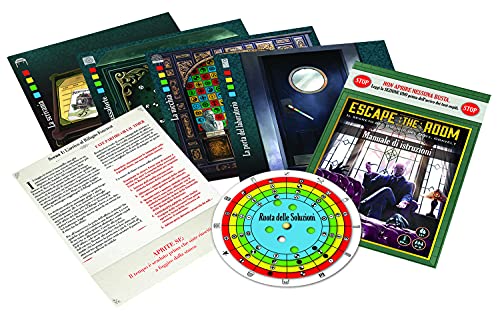 La scatola contiene: una scheda scena, 5 buste sigillate che contengono indizi segreti, una ruota con simboli e e un manuale di istruzioni;