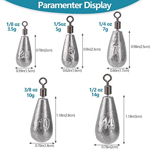 MERAVIGLIOSI PESI DI PESCA: Meraviglioso set per le tue battute di pesca. I pesi Drop Shot saranno un'aggiunta eccellente a qualsiasi scatola di attrezzatura terminale. Materiale: piombo e acciaio inossidabile. Tre scelte: 28 pesi a forma snella (totale 246 g/8,67 oz), 28 pesi a forma di goccia (totale 246 g/8,67 oz), 103 pezzi Drop Shot Rig Tackle Box (totale 338 g/11,92 oz).