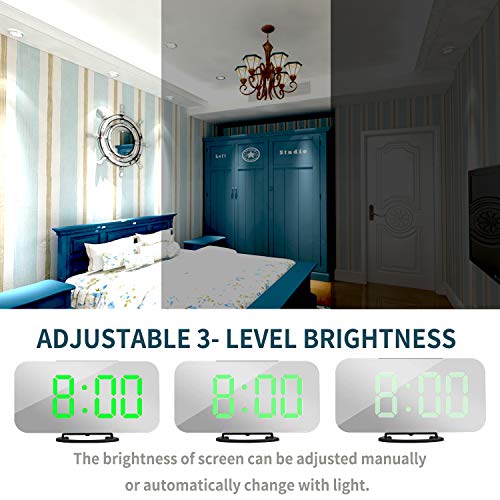ThreeH Sveglia Ampio Display Superficie a Specchio per Il Trucco con 2 Porte di Ricarica USB modalità Snooze dimmer 3 Luminosità Regolabile Nero-Verde