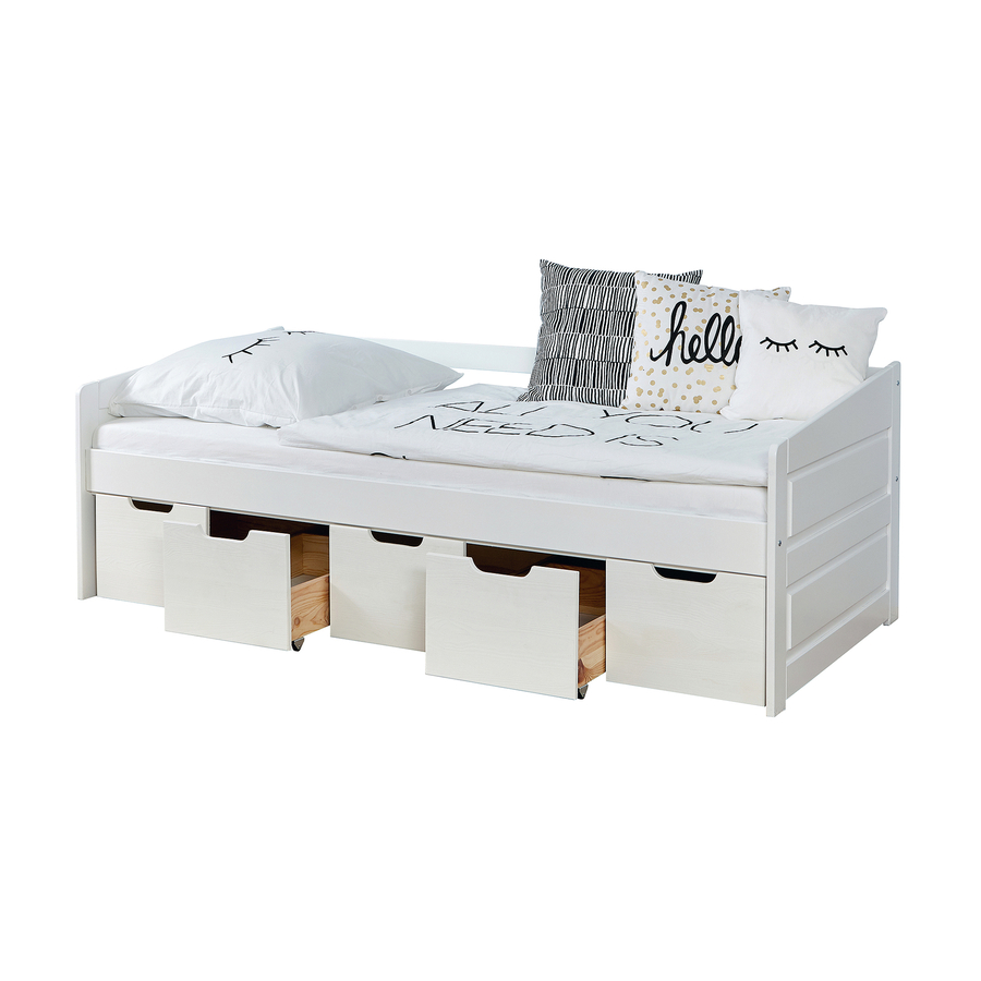 Il divano letto Micki è l'alternativa perfetta al letto normale nella camera dei bambini e dei giovani. Offre una normale superficie sdraiata su cui è meravigliosamente rilassante, ma può essere utilizzata anche come seduta per più persone grazie agli schienali. L'intero letto è realizzato in faggio massiccio e colpisce per la sua elevata stabilità e capacità di carico. Dettagli tecnici: Divano letto Colore: bianco Materiale: faggio massiccio, verniciato Superficie di sdraio: larghezza x lunghezza 90 x 200 cm Dimensioni: larghezza x lunghezza x altezza 98 x 204 x 60-70 cm Altezza massima del materasso: 16-25 cm 5 Spinta aden Incluso nella consegna: divano letto 5 Spinta aden Attenzione: griglia avvolgibile, materasso e decorazione non sono compresi nella fornitura