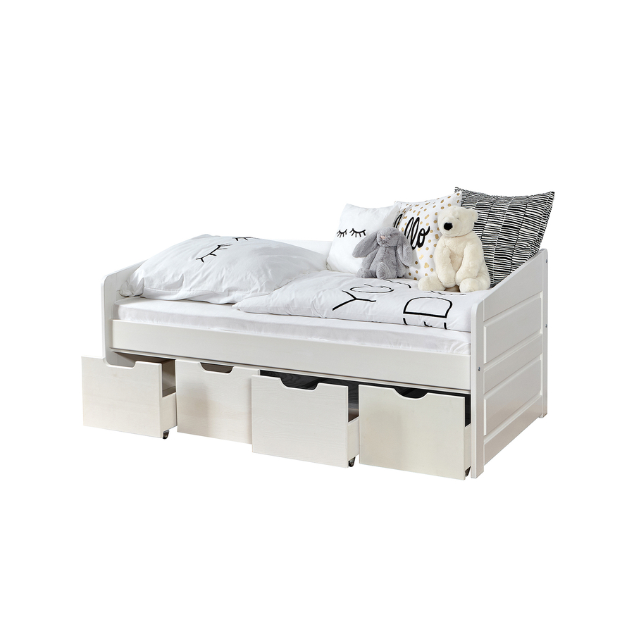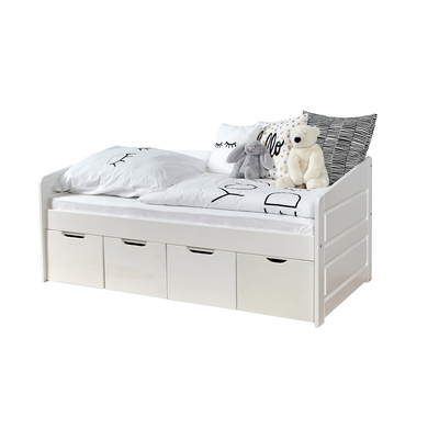 Il divano letto Mini Micki è l'alternativa perfetta al letto normale nella camera dei bambini e dei giovani. Offre una superficie sdraiata di 80 x 160 cm, sulla quale è meraviglioso rilassarsi, ma può essere utilizzata anche come seduta per diversi bambini grazie agli schienali. Dettagli tecnici: Divano letto colore: bianco Materiale: faggio massiccio, verniciato Superficie di sdraio: larghezza x lunghezza 80 x 160 cm Dimensioni: larghezza x lunghezza x altezza 88 x 164 x 60-70 cm Altezza massima del materasso: 15 cm 4 cassetti avvolgibili aden per un maggiore spazio di stoccaggio Materasso Dimensioni: larghezza x lunghezza 80 x 160 cm Materiale del nucleo: schiuma Materiale di copertura: 100 % poliestere Incluso nella consegna: Divano letto Piano letto avvolgibile Materasso 4 cassetti aden Attenzione: la decorazione non è inclusa