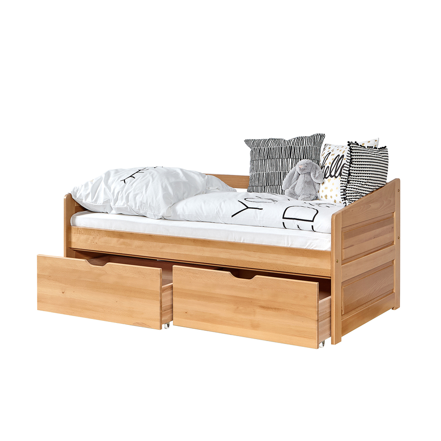 Il divano letto Mini Micki è l'alternativa perfetta al letto normale nella camera dei bambini e dei giovani. Offre una superficie sdraiata di 80 x 160 cm, sulla quale è meraviglioso rilassarsi, ma può essere utilizzata anche come seduta per diversi bambini grazie agli schienali. Dettagli tecnici: Divano letto Colore: naturale Materiale: faggio massiccio, verniciato Superficie di sdraio: larghezza x lunghezza 80 x 160 cm Dimensioni: larghezza x lunghezza x altezza 88 x 164 x 60-70 cm Altezza massima del materasso: 15 cm 2 cassetti avvolgibili aden per un maggiore spazio di stoccaggio Materasso Dimensioni: larghezza x lunghezza 80 x 160 cm Materiale del nucleo: schiuma Materiale di copertura: 100 % poliestere Incluso nella consegna: Divano letto Piano letto avvolgibile Materasso 2 cassetti aden Attenzione: la decorazione non è inclusa
