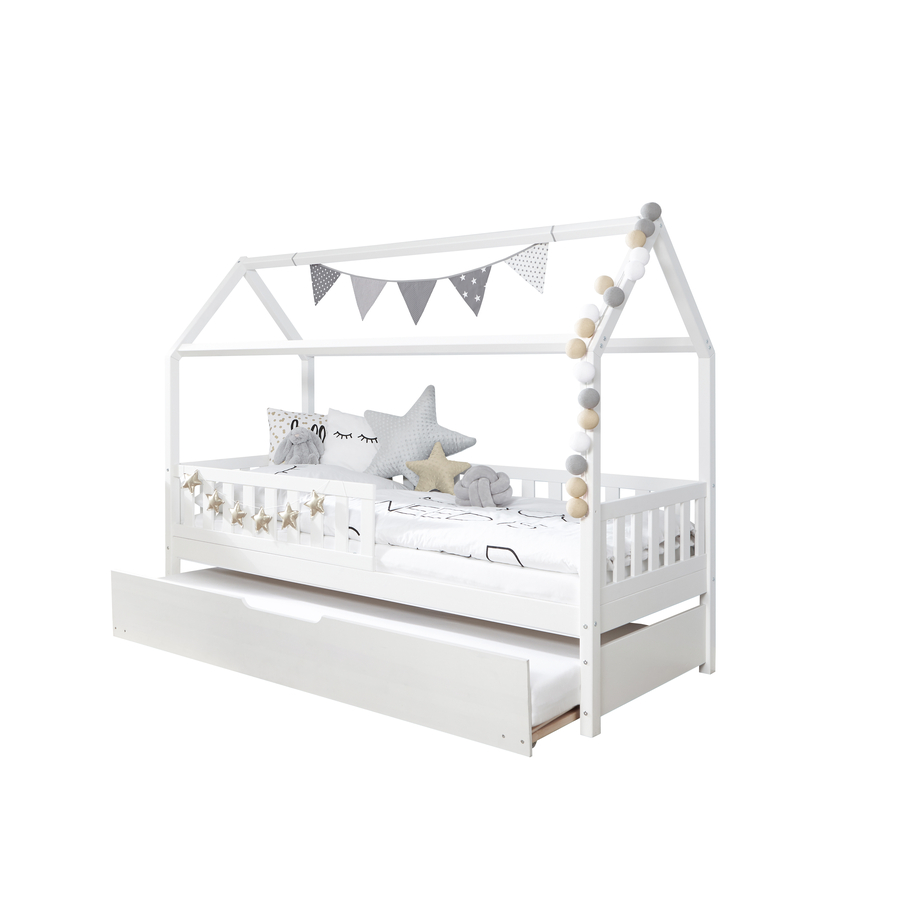 Questo letto è più di un posto comodo per far dormire il tuo bambino! La casa letto Dream House con la sua costruzione del tetto per il design individuale diventerà rapidamente il punto focale della camera del vostro bambino. Dettagli del prodotto: Colore: bianco Materiale: pino massiccio, laccato Superficie di sdraio: larghezza x lunghezza 90 x 200 cm Dimensioni: larghezza x lunghezza x altezza 209 x 96 x 169 cm Spessore del palo: 4,5 x 4,5 cm Altezza massima del materasso: 18 cm Incluso il letto aggiuntivo Incluso nella consegna: Letto da casa Letto aggiuntivo Si prega di notare: materasso, base a scomparsa, cuscini e decorazione non sono inclusi nella consegna