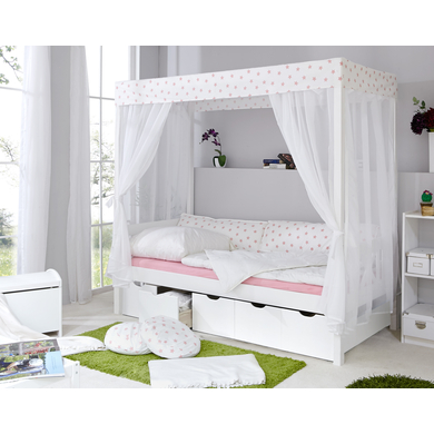 Un fantastico letto a baldacchino per la cameretta dei bambini. L'ideale per sogni da favola. Dettagli del prodotto: Colore: bianco/rosa Materiale: Pino massiccio, laccato Superficie di riposo: 90 x 200 cm Dimensioni: Ampiezza x Lunghezza x Altezza 97,5 x 211 x 182 cm tetto incluso Parte superiore removibile 5 cassetti Dimensioni montanti: 5,4 x 5,4 mm Profondità: 7 cm Altezza da terra: 31 cm Portata massima: 75 kg Altezza massima del materasso: 18 cm Abbinate a questo letto sono consigliate le doghe avvolgibili TICAA. Non adatto per reti a doghe con struttura. Incluse nella confezione: Letto a baldacchino con tende Materiale per il montaggio Istruzioni per il montaggio Attenzione: La rete, il materasso, le doghe e le decorazioni non sono incluse nella spedizione