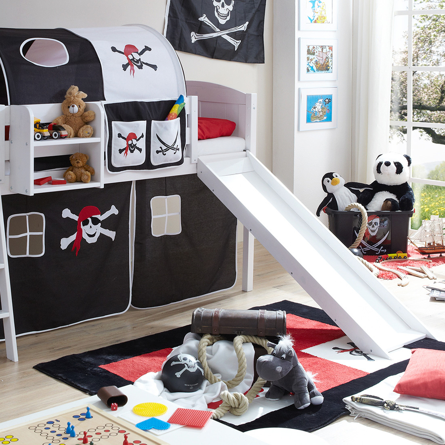 Per questo letto si consigliano solo reti a doghe TiCAA. Non adatto a telai a doghe fisse Tendine Colore: nero/bianco Design: Pirati Materiale: 100% cotone Incluso nella consegna: Letto con scivolo Tendine Attenzione: Reti, materasso, tunnel, tasche portaoggetti, mensole e decorazioni NON incluse.