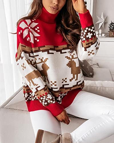 Ticticlily Maglione Donna Natalizio Collo Alto Maglione per Natale Pullover Invernale Casual Chic Quotidiano Feste Rosso M