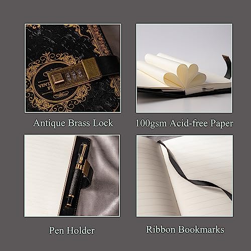 TIEFOSSI Diario vintage in pelle con lucchetto a combinazione, formato B6, con motivo floreale in rilievo, a righe, per scrivere, regalo per donne, ragazze e bambini (nero)