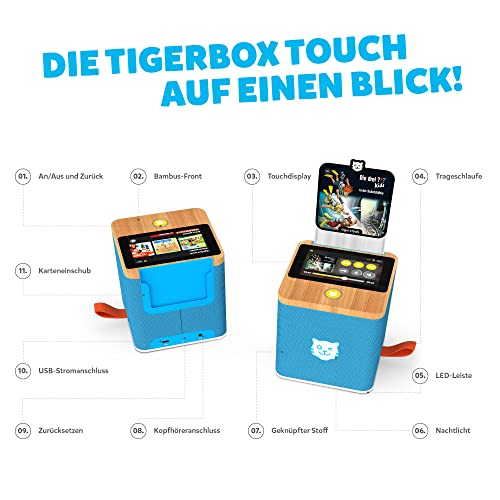 La tigerbox Touch può riprodurre in streaming oltre 15.000 giochi di ascolto, audiolibri e musica o riprodurre singoli contenuti selezionati tramite una scheda tigercard. Con la carta wildcard vengono registrati e riprodotti i propri contenuti