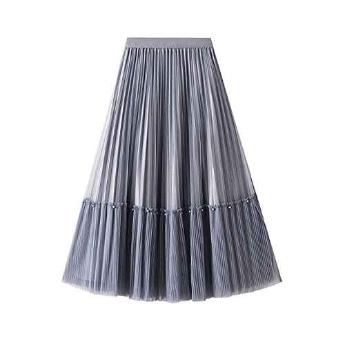 TiiLyy Gonna Longuette in Tulle da Donna Gonna a Pieghe con Perline Abito Lungo Reversibile in Rete impiombata, Grigio