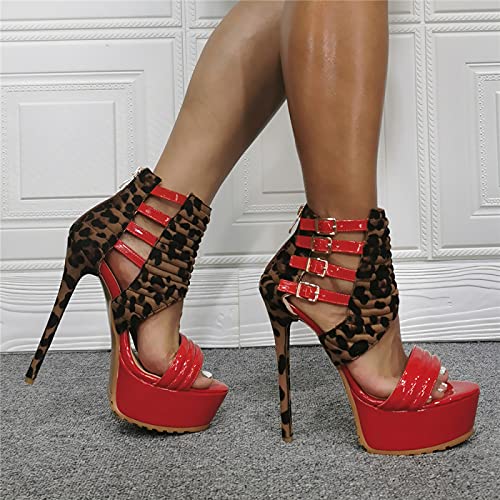 TIKENBST Tacchi Donna Sandali con Tacco Alto 16 Cm con Plateau Impermeabile Stampa Leopardata Scava Fuori Sandali alla Moda di Grandi Dimensioni,Red-37