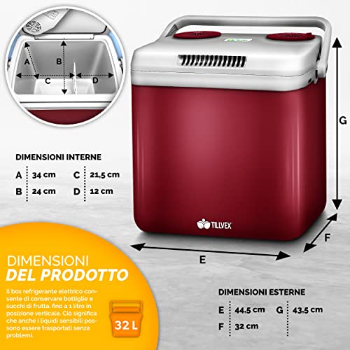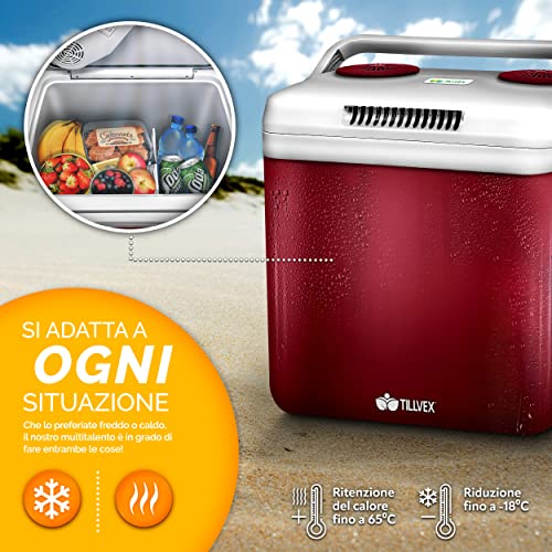 Tillvex Frigorifero elettrico Portatile da 32L | Mini-frigorifero campeggio da 230V e 12V per auto, camion, barca o camper | rinfresca e riscalda | modalità ECO (Rosso)